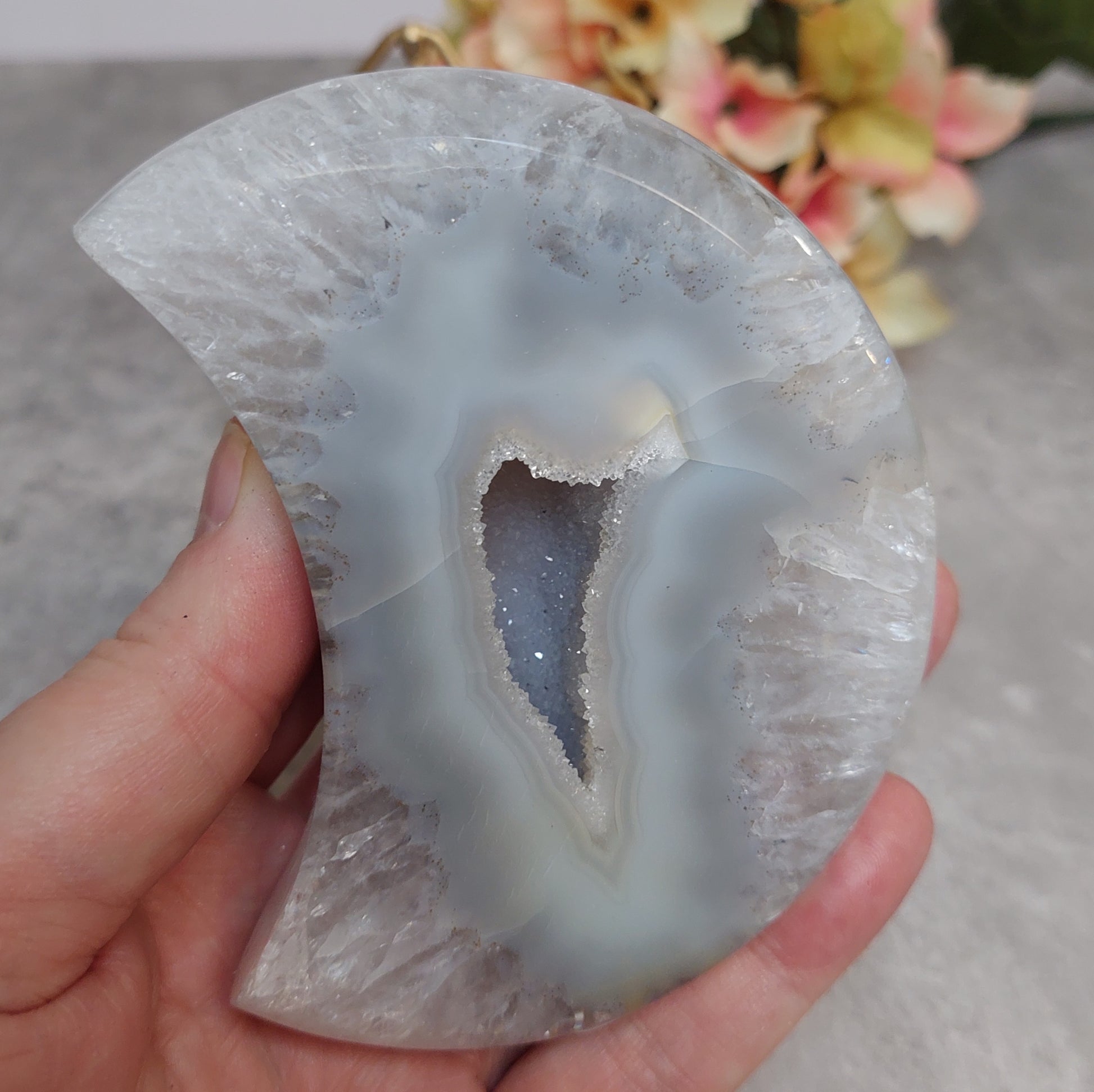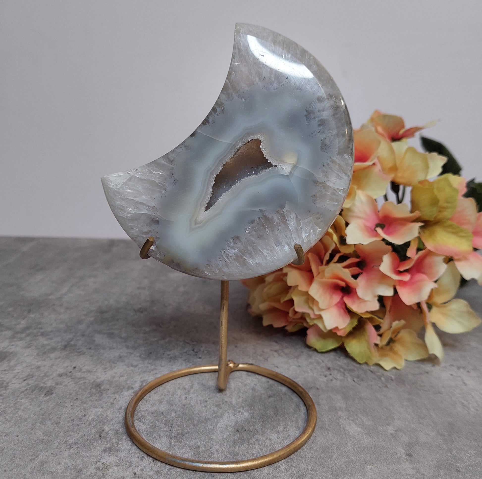 Kaunis Brasilian pientuotantona tuotettu akaattikvartsi skuu, jossa druusinen keskusta. Teline on kullanvärinen.