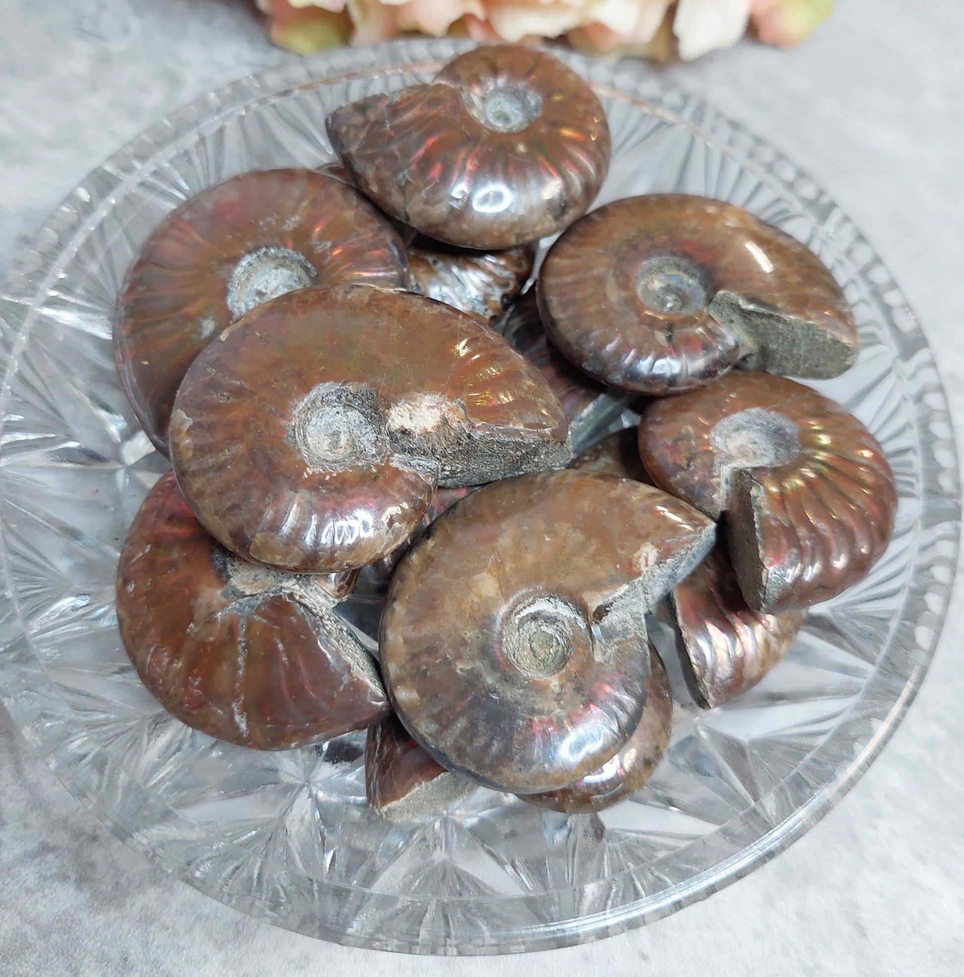 Pieniä ammoniittejä. Ei laasdun huippuyksilöitä, mutta asialliset välkkeet jokaisessa.