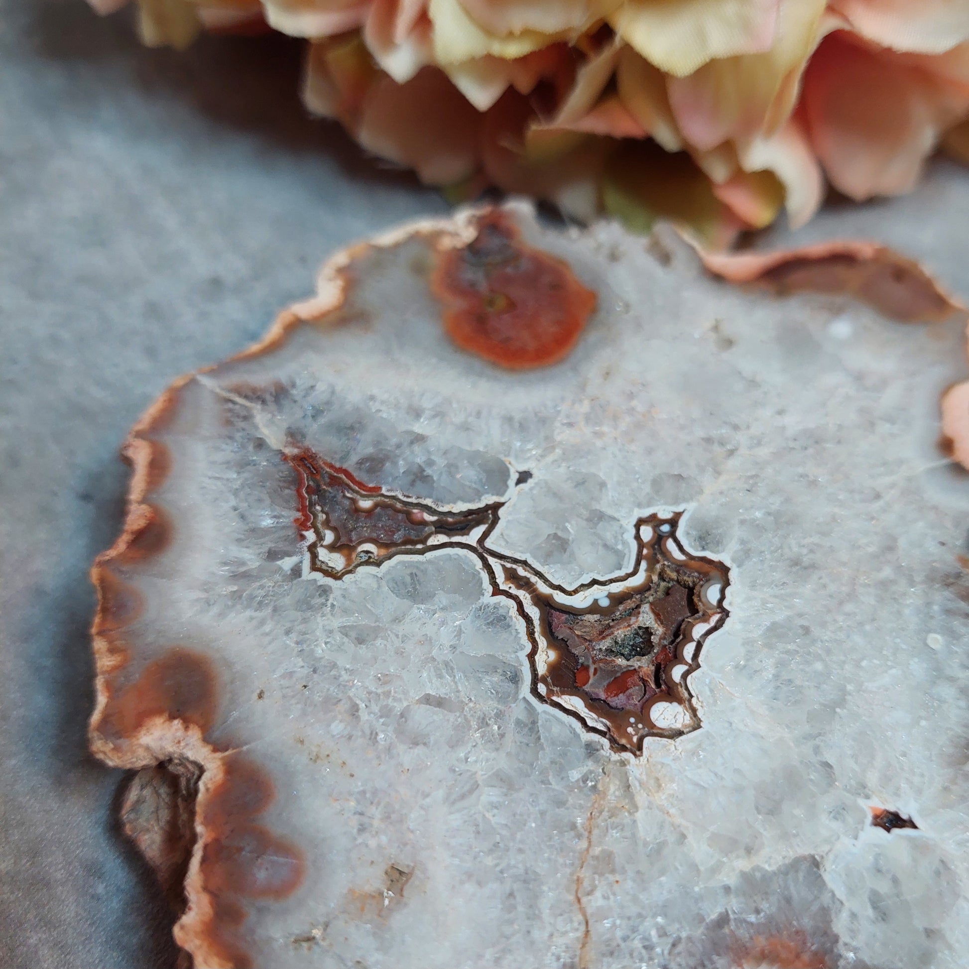 Herkkä pitsikuvioinen kvartsi-akaatti laatta. Nöäitä kutsutaan argentiina akaateiksi.
