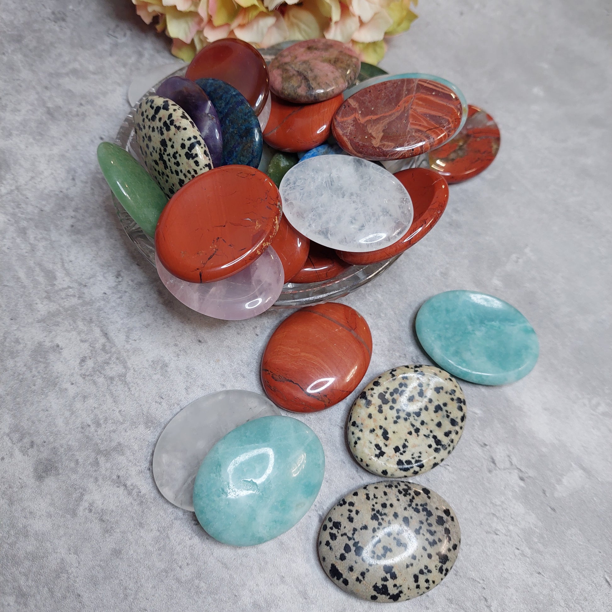 Huolikivet ovat ovaalinmuotoisia kämmenkiviä, joissa on peukalolle sopiva kuoppa. Tämän tuotteen ostaessasi saa kuvan kasasta yhden yksilön arvalla. Jos valitset useamman pyrimme toimittamaan eri kivilajeja