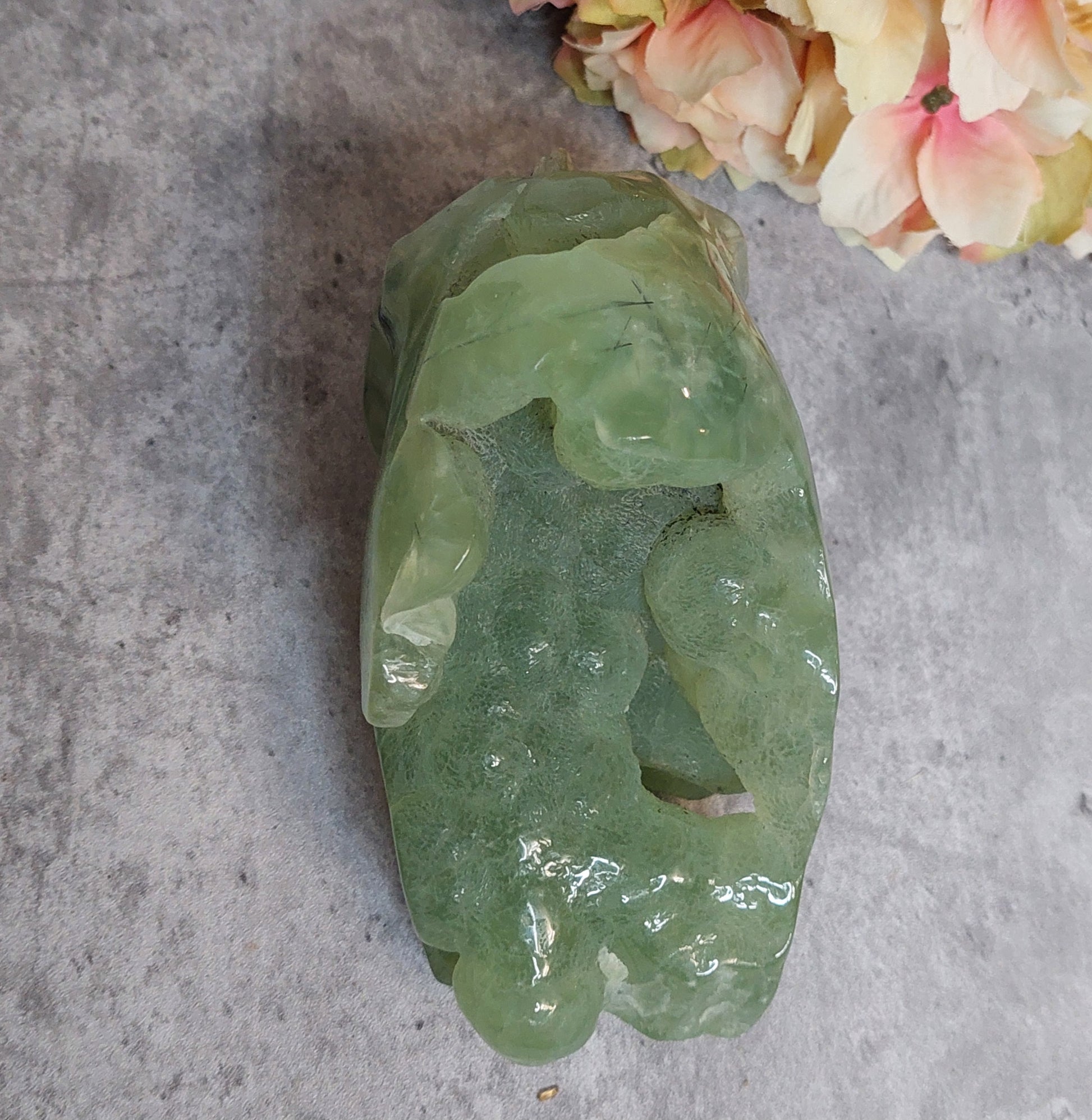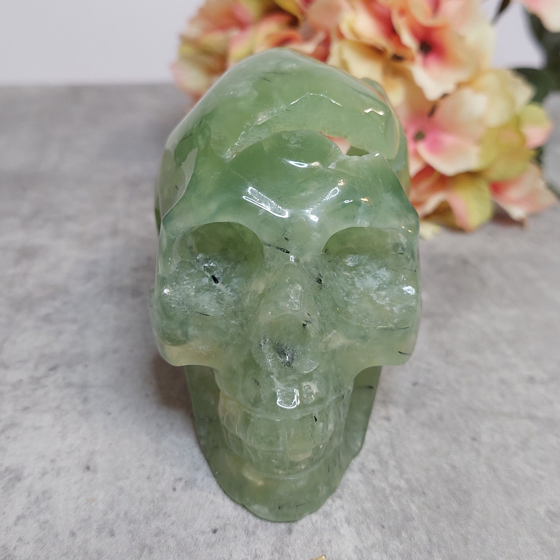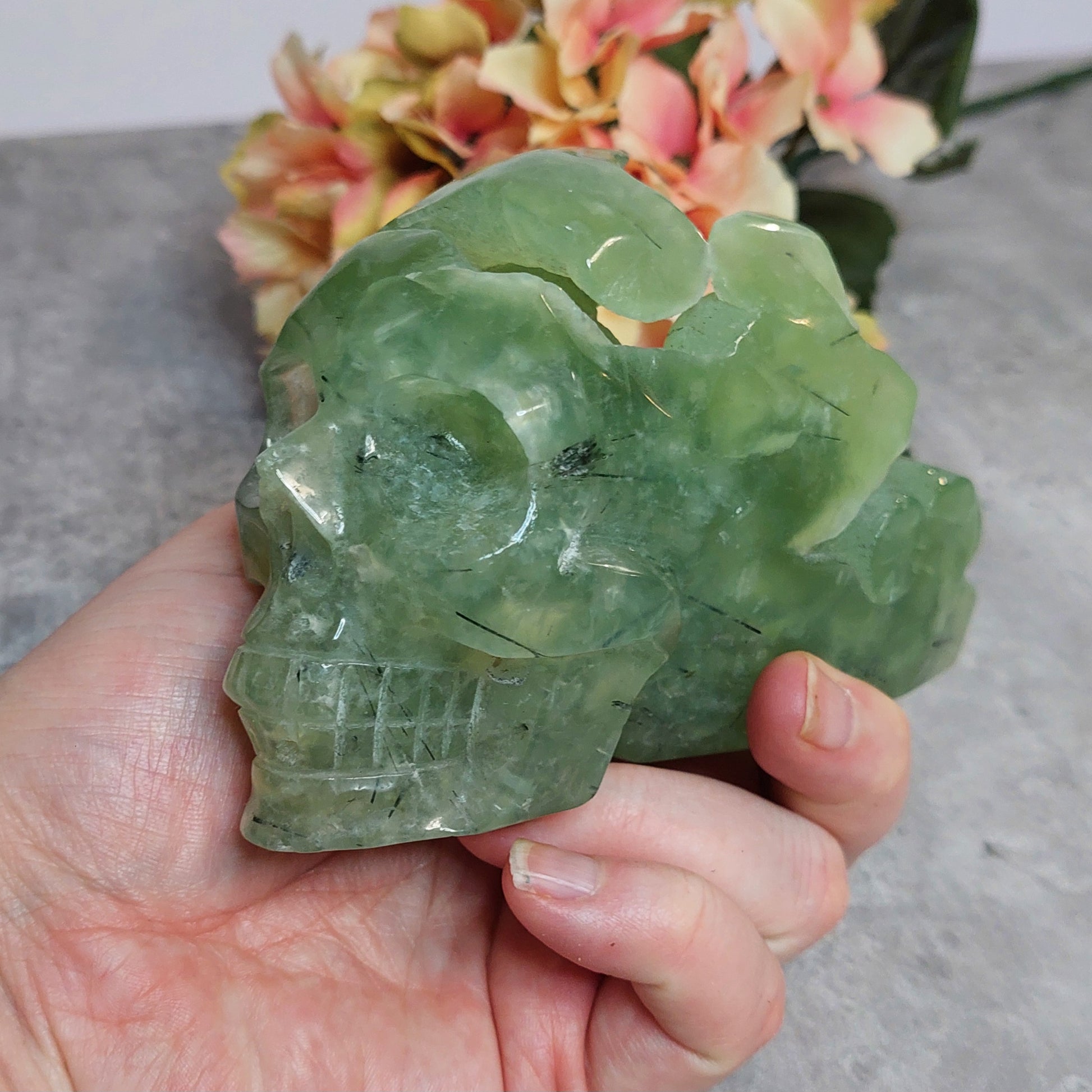 Upea iso perhniittikallo, jossa takaraivo lätetty raa'aksi. Erittäin laadukasta vaalean vihreää prehniittiä