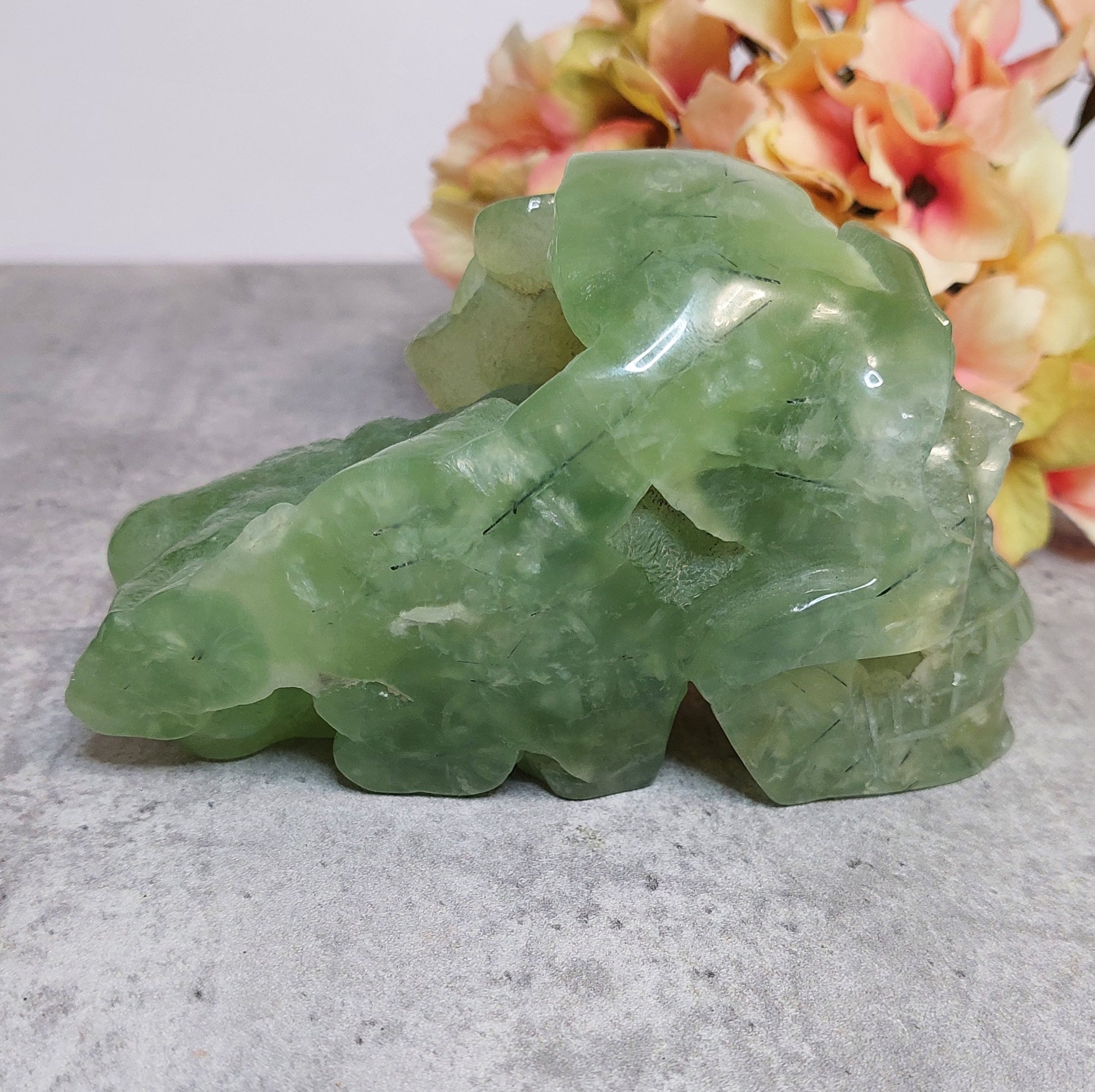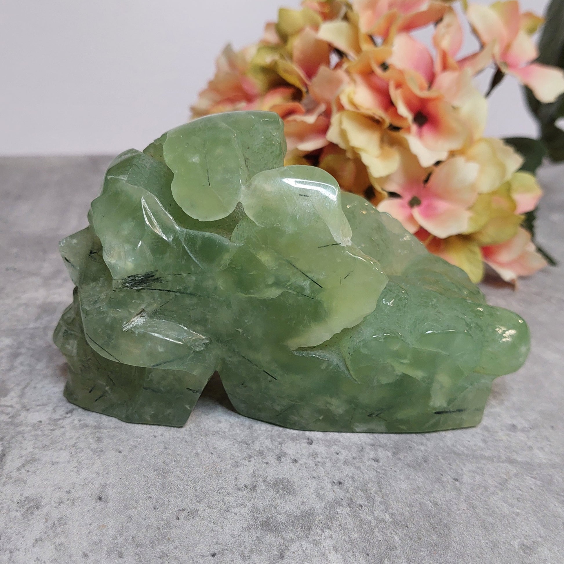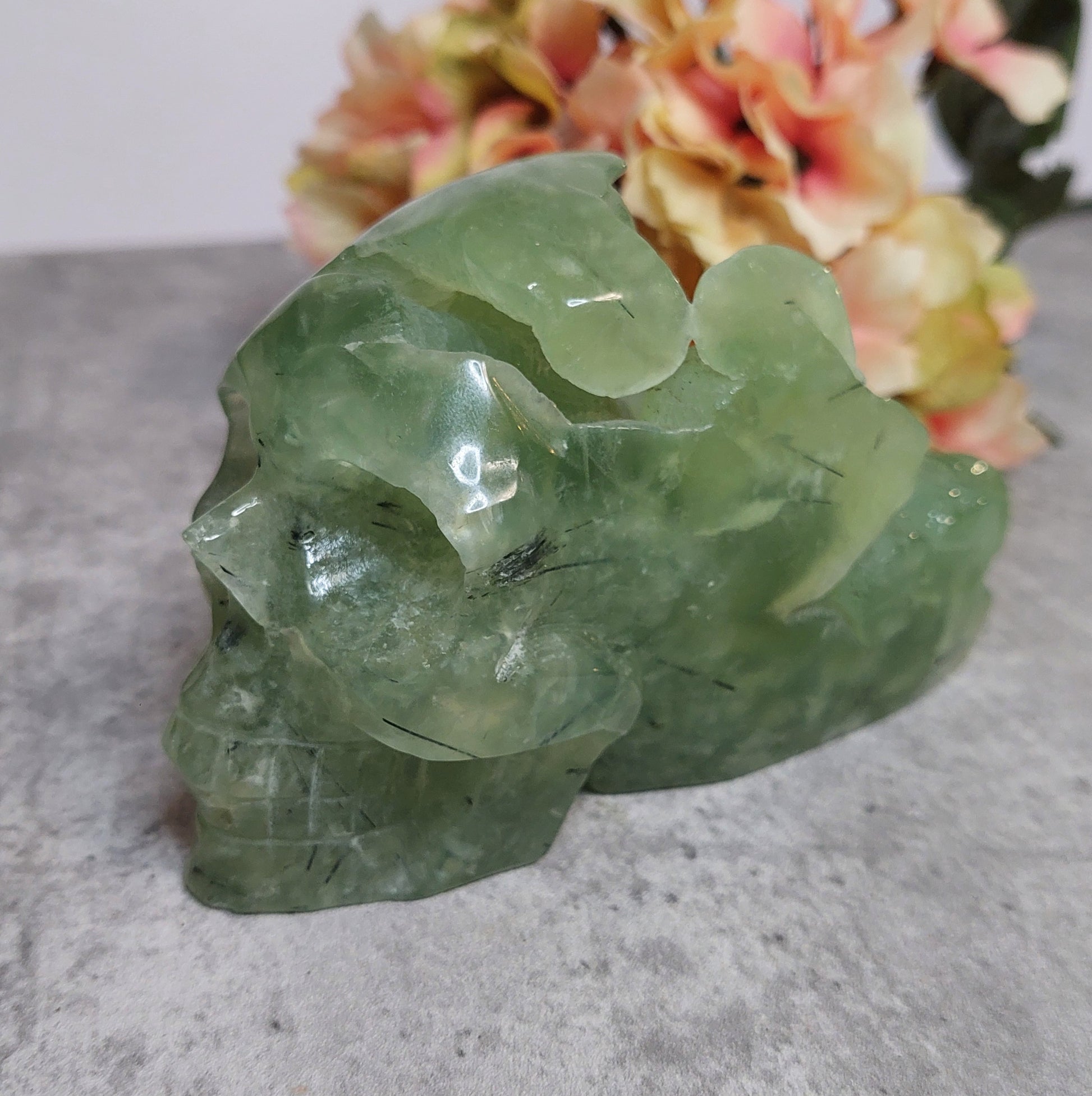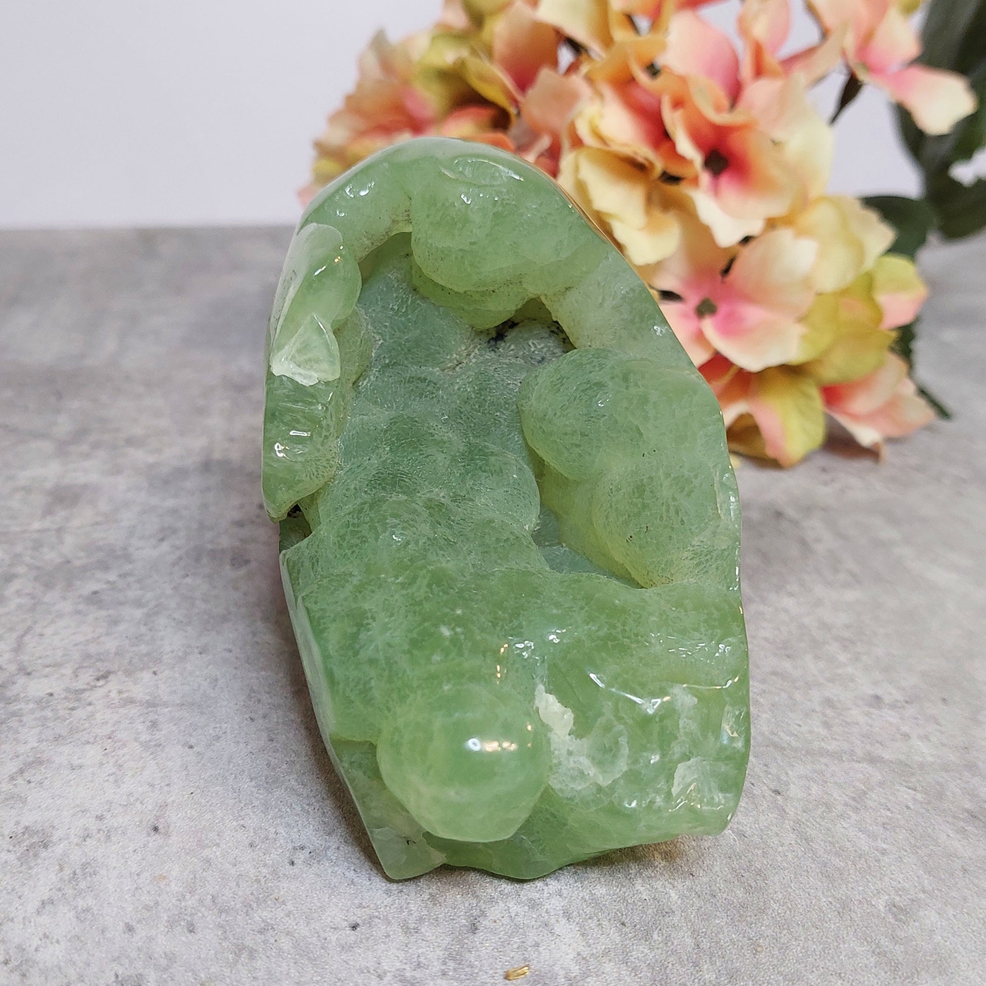 Upea iso perhniittikallo, jossa takaraivo lätetty raa'aksi. Erittäin laadukasta vaalean vihreää prehniittiä