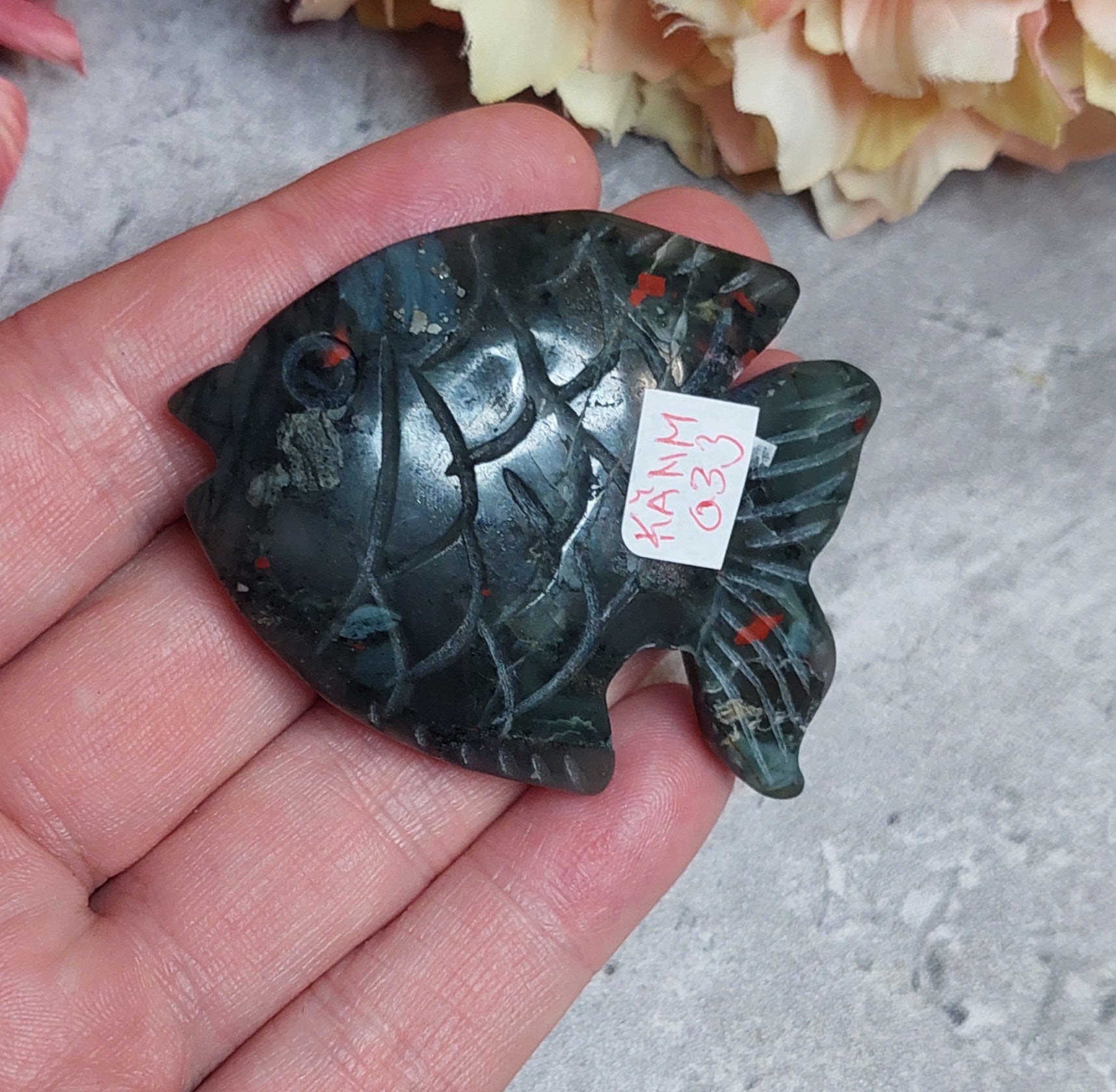 Käteen sopiva kalanmuotoinen kämmenkivi. Erikoisempi muoto, mutta sopii hyvin käteen.