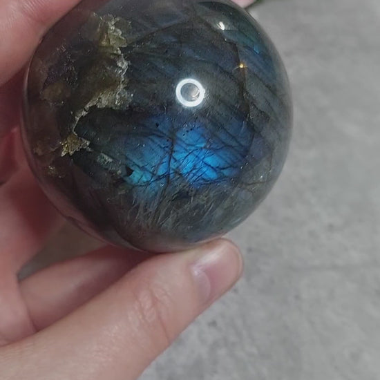 Monivälkkeinen labradoriittipallo, jossa yksi suuri kiillepinta pallossa. Kiille sinisävyinen.