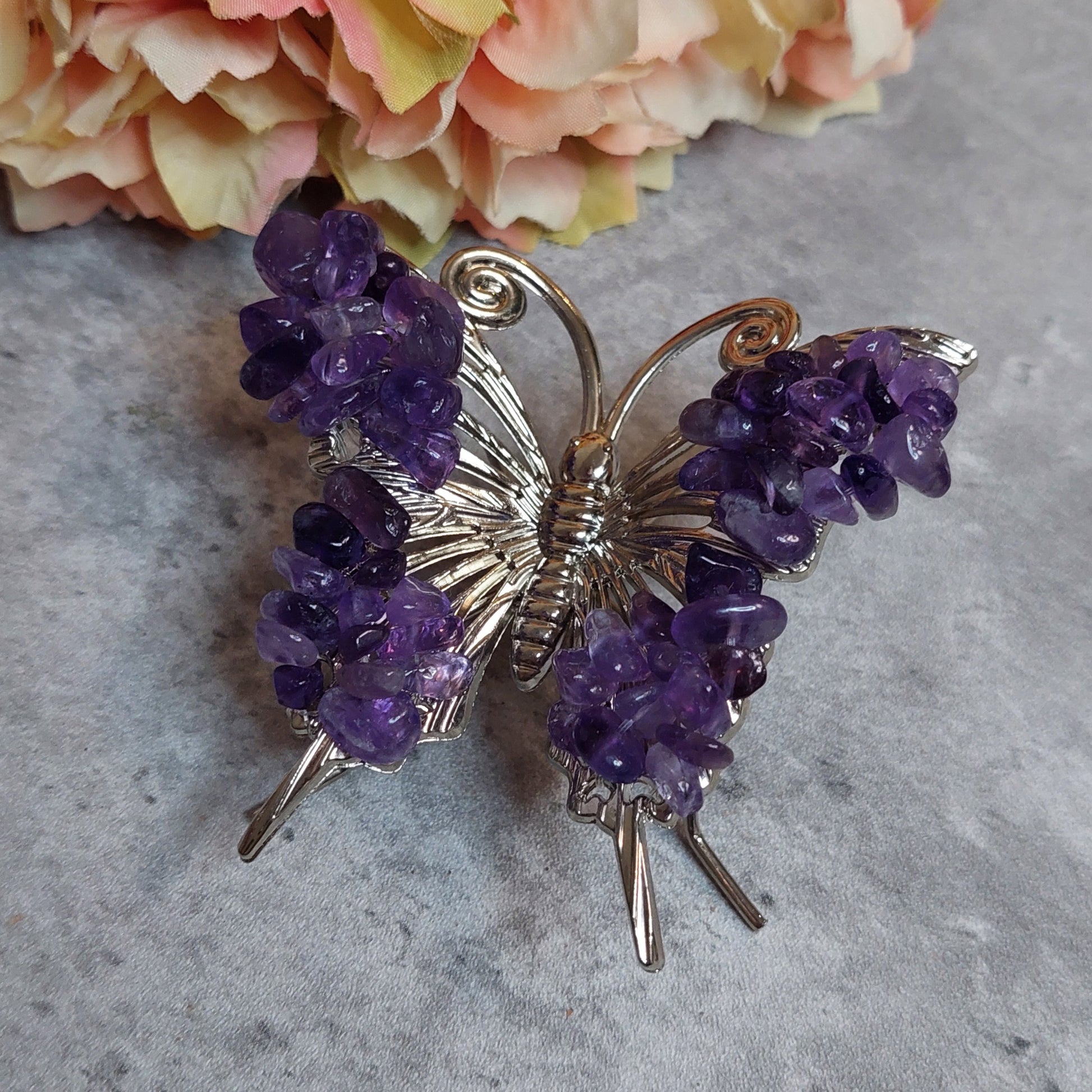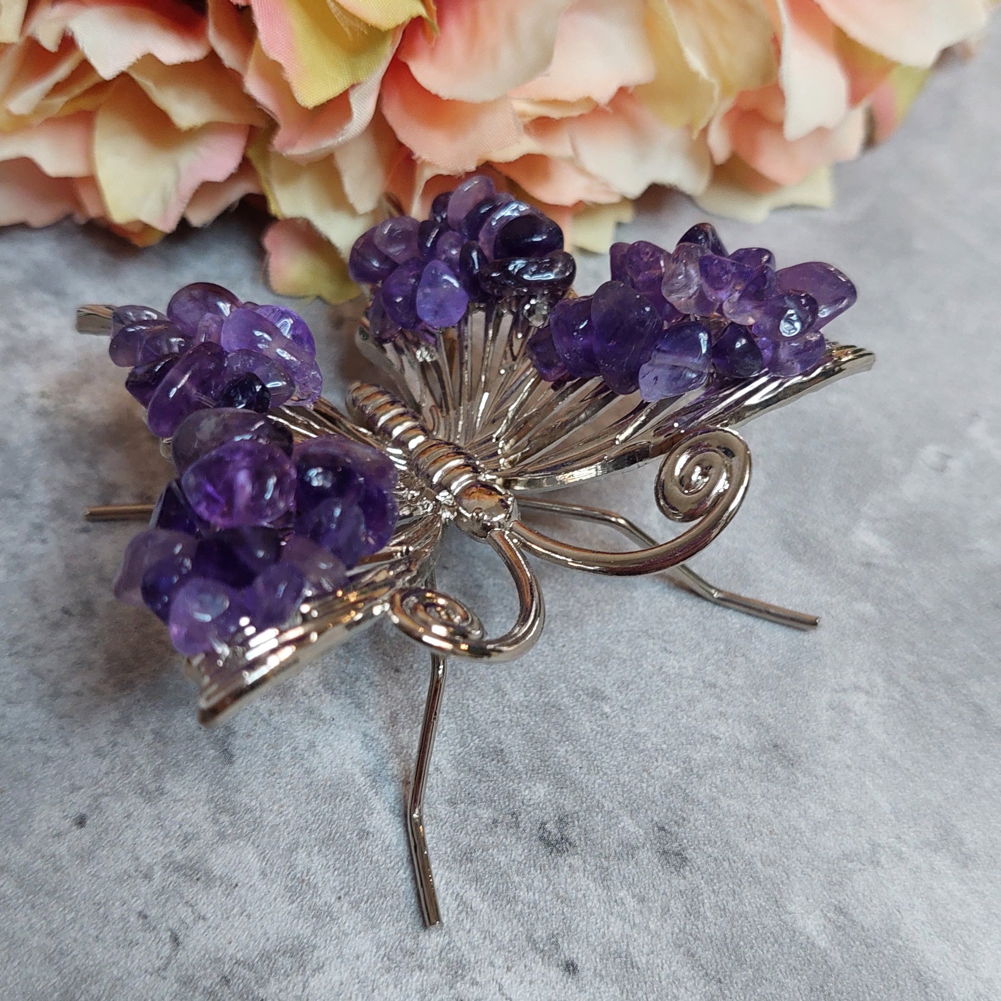 Hopean värinen metalliperhonen, jolla ametisti sirua siivissä.