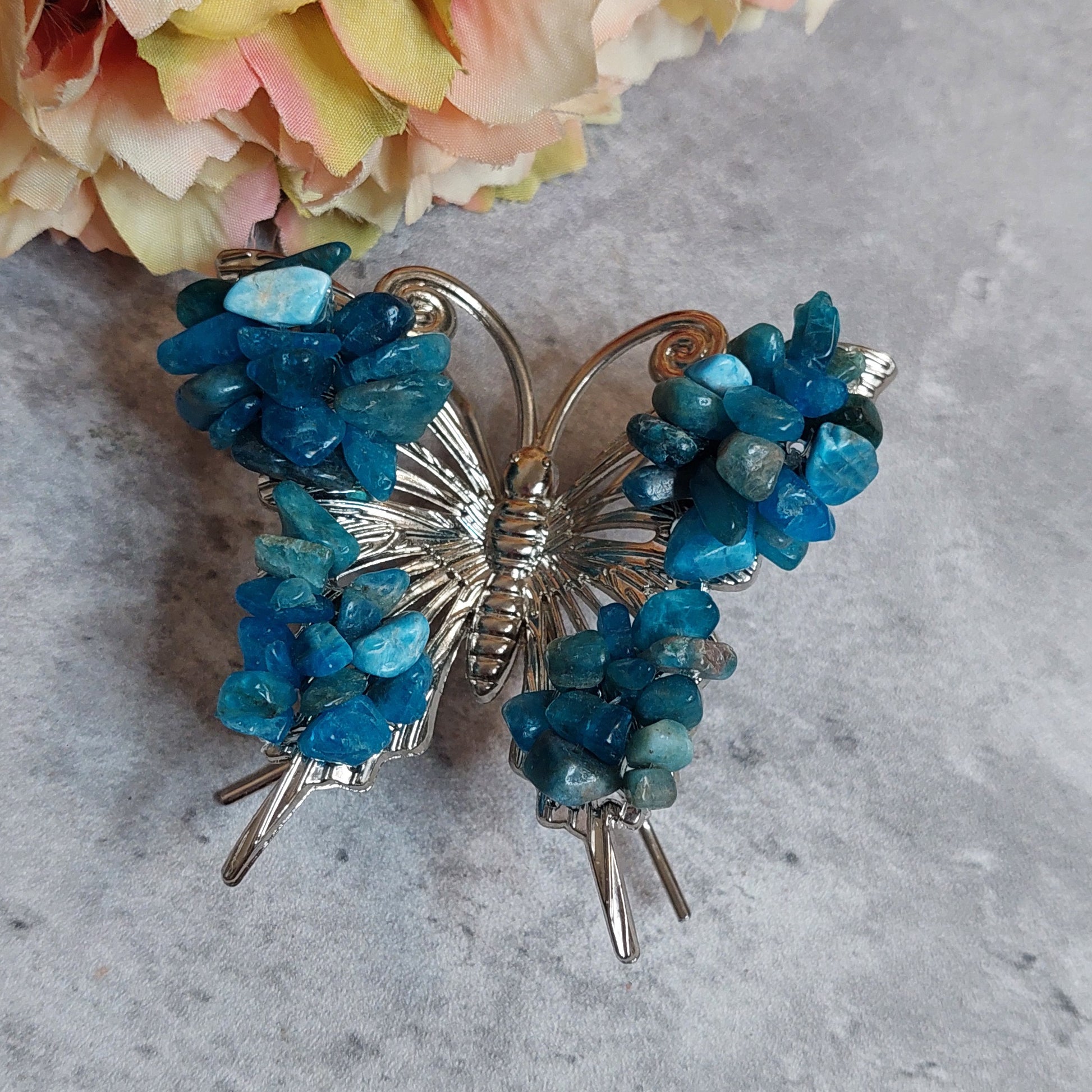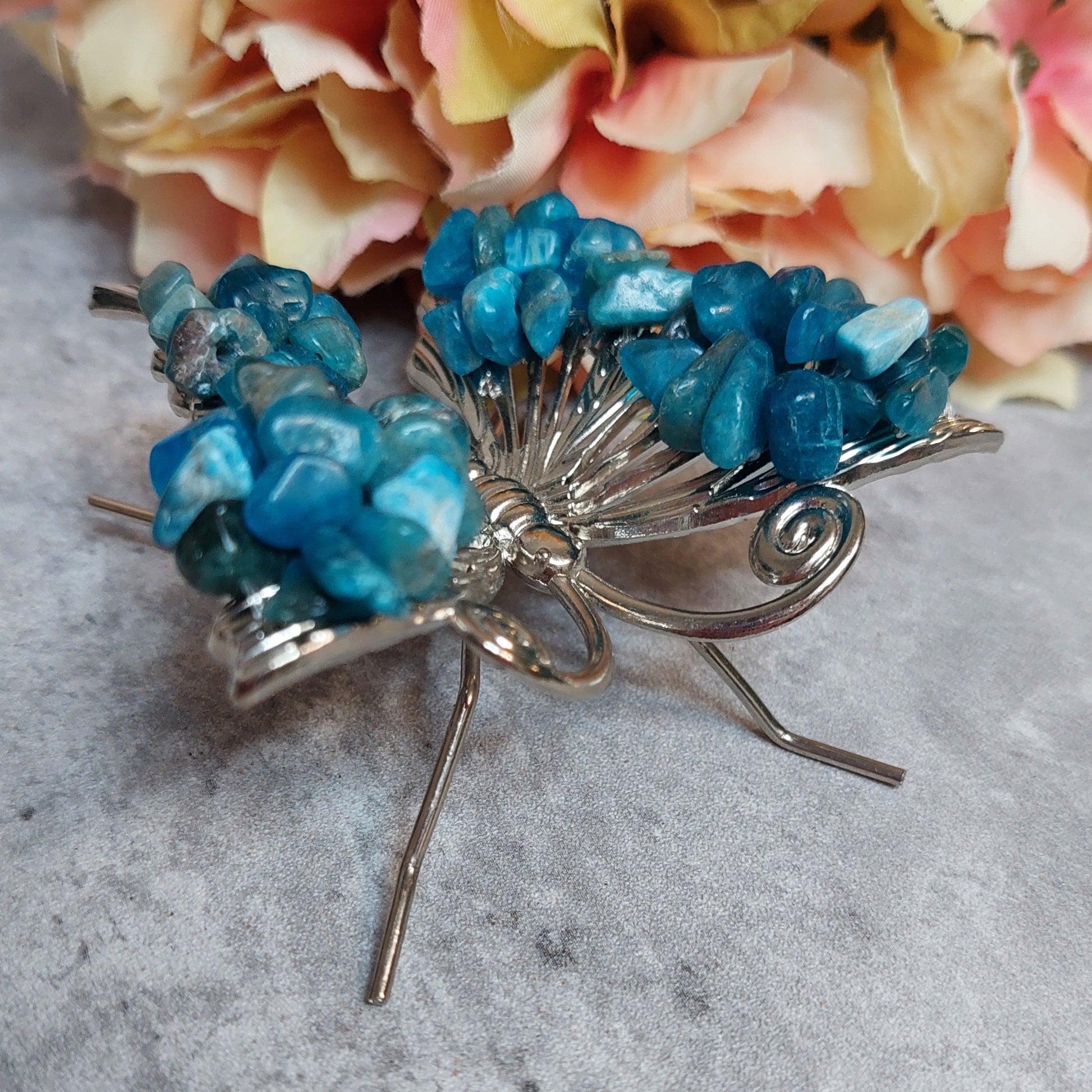 Hopean värinen metalliperhonen, jolla apatiitti sirua siivissä.