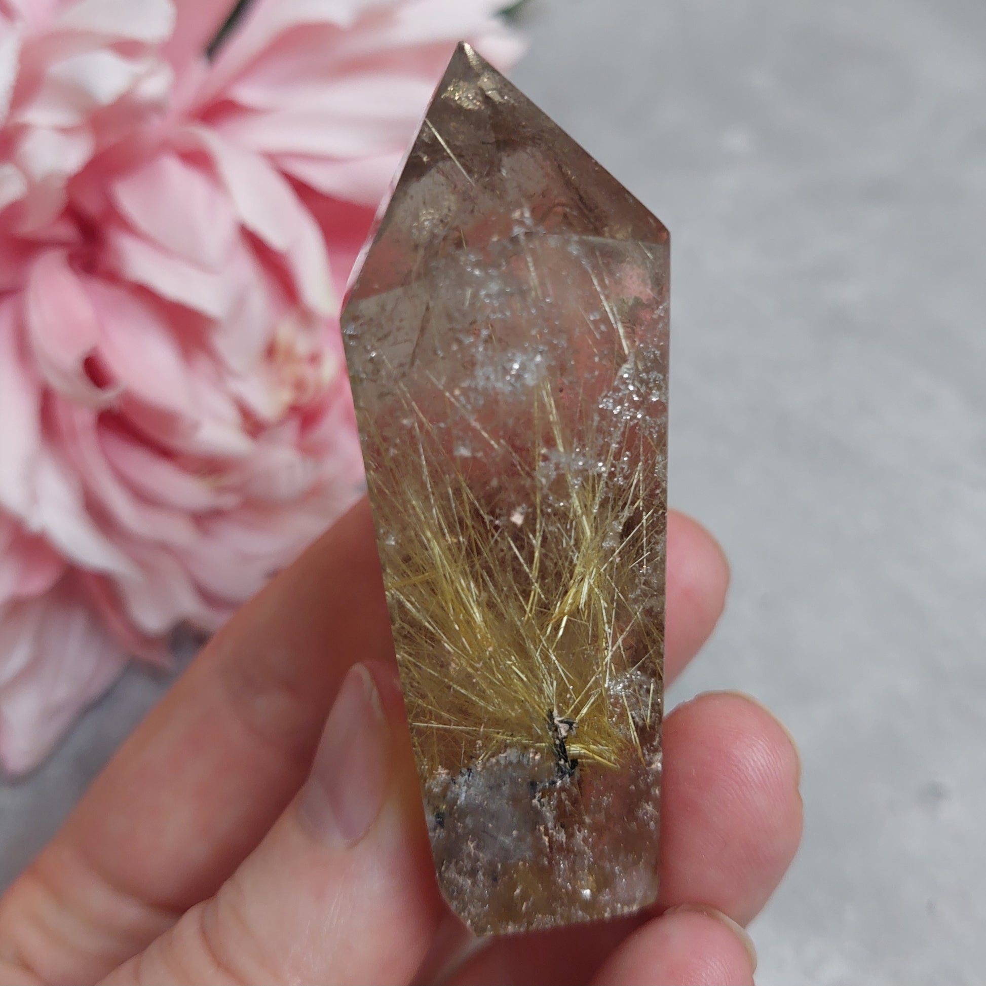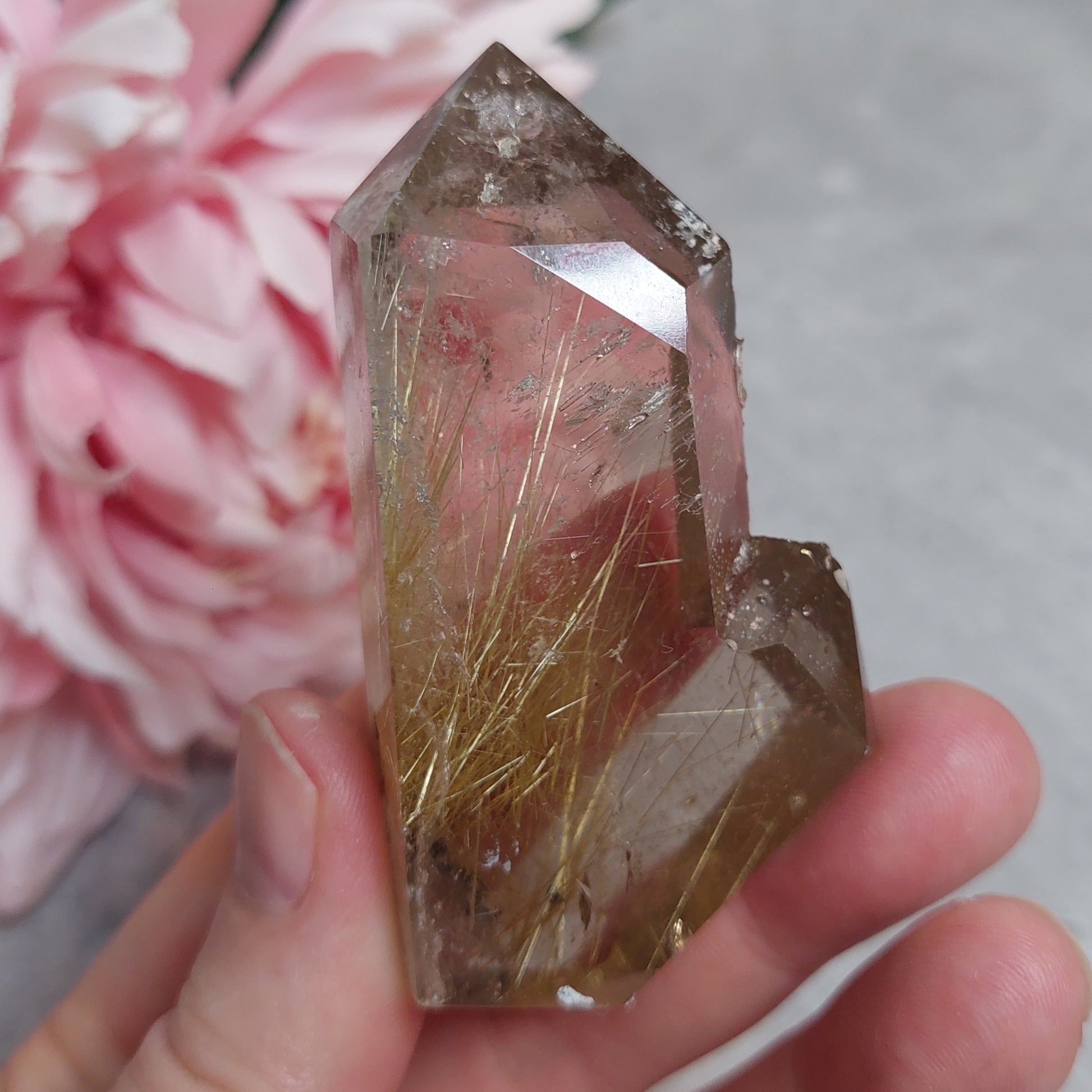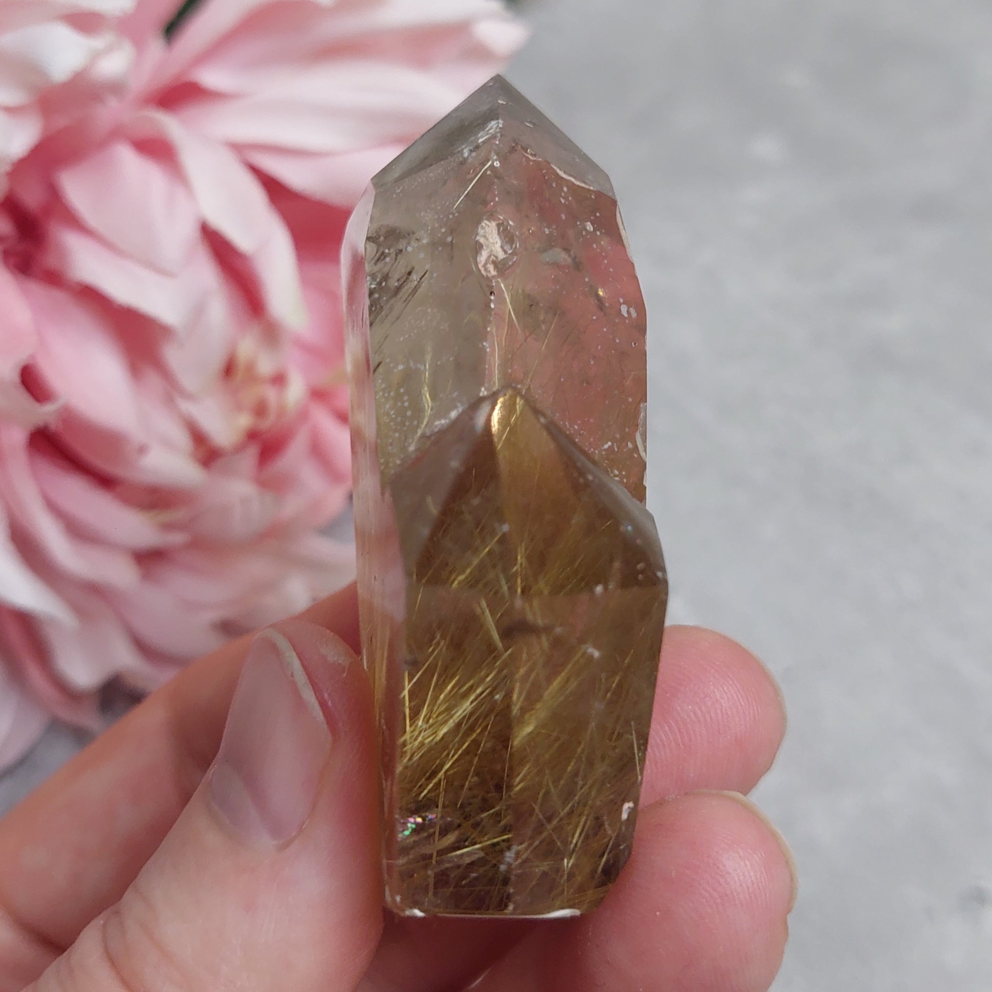 Kirkkaassa savukvartsipohjassa kultaista rutiilia. Malli kaksikärkinen torni.