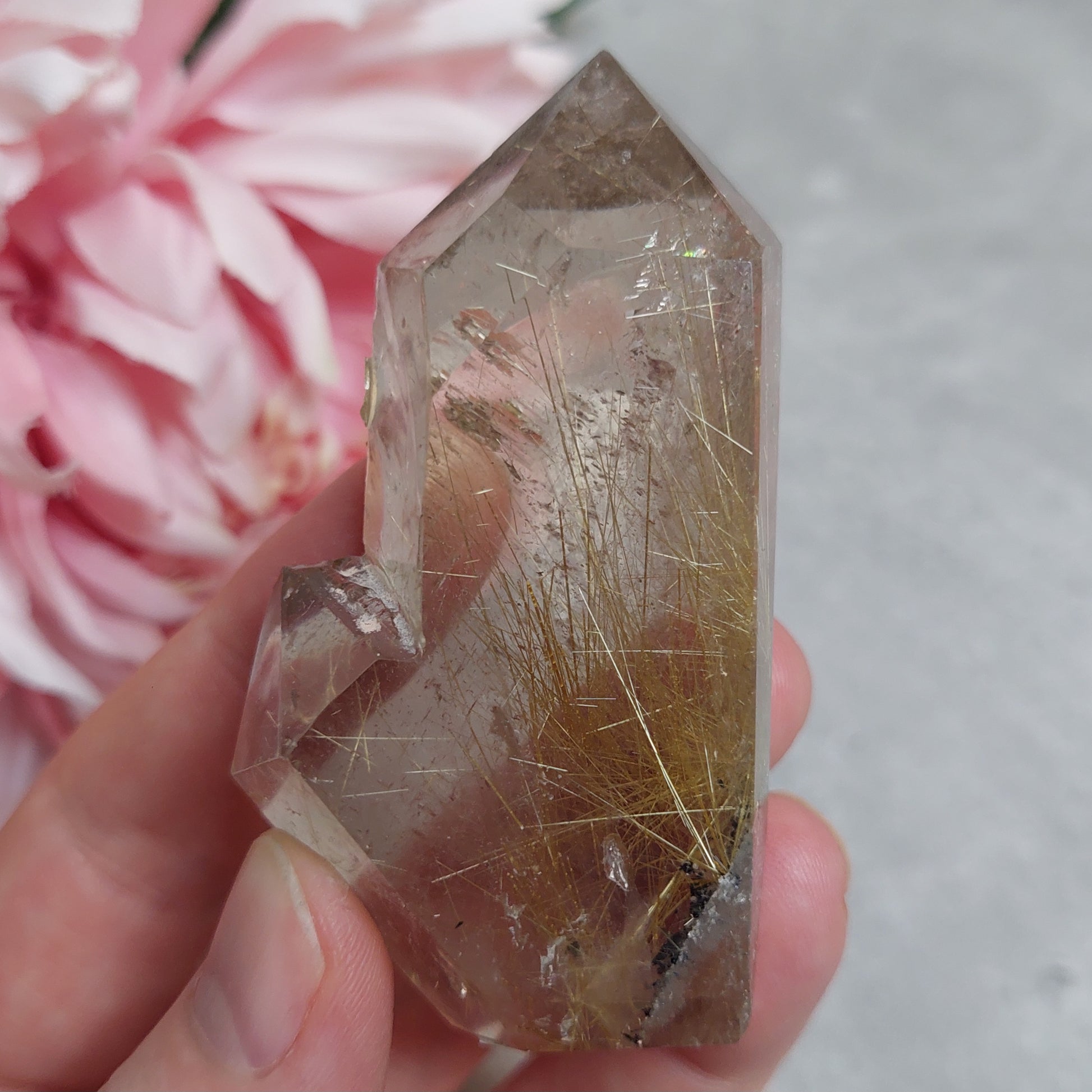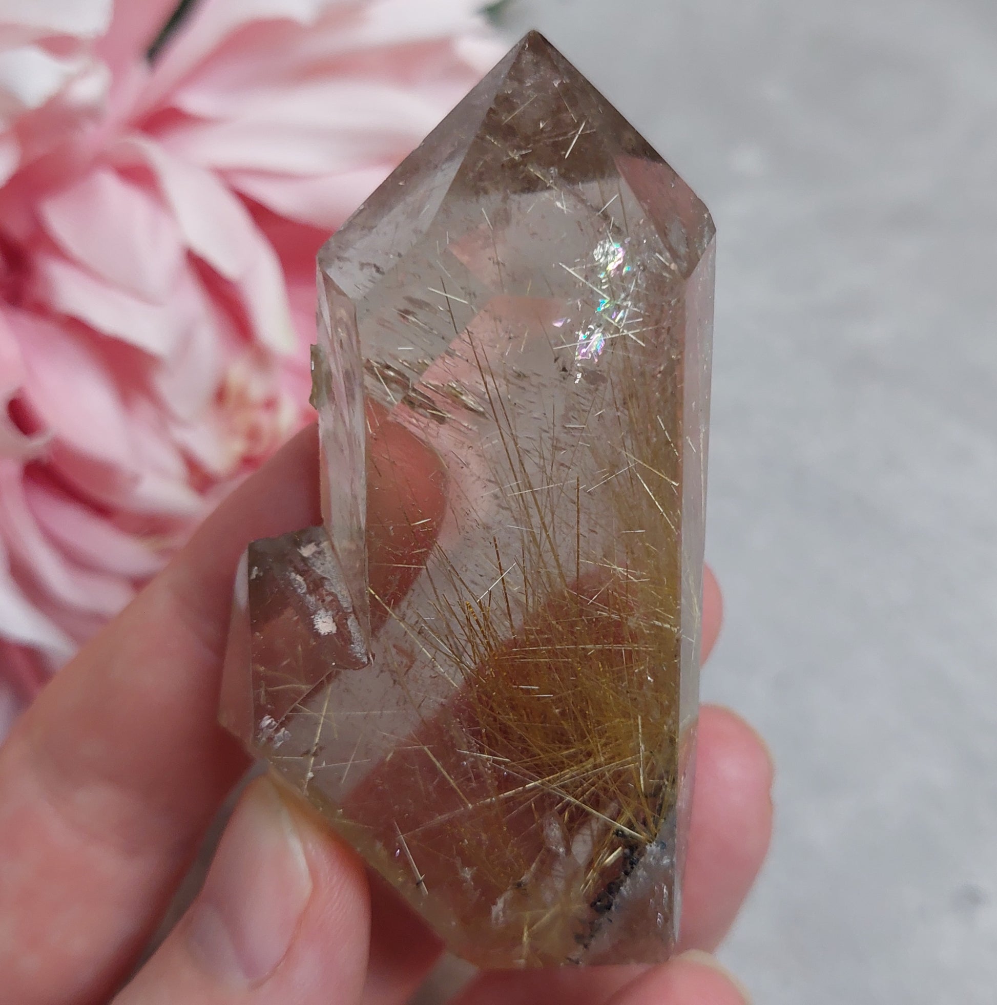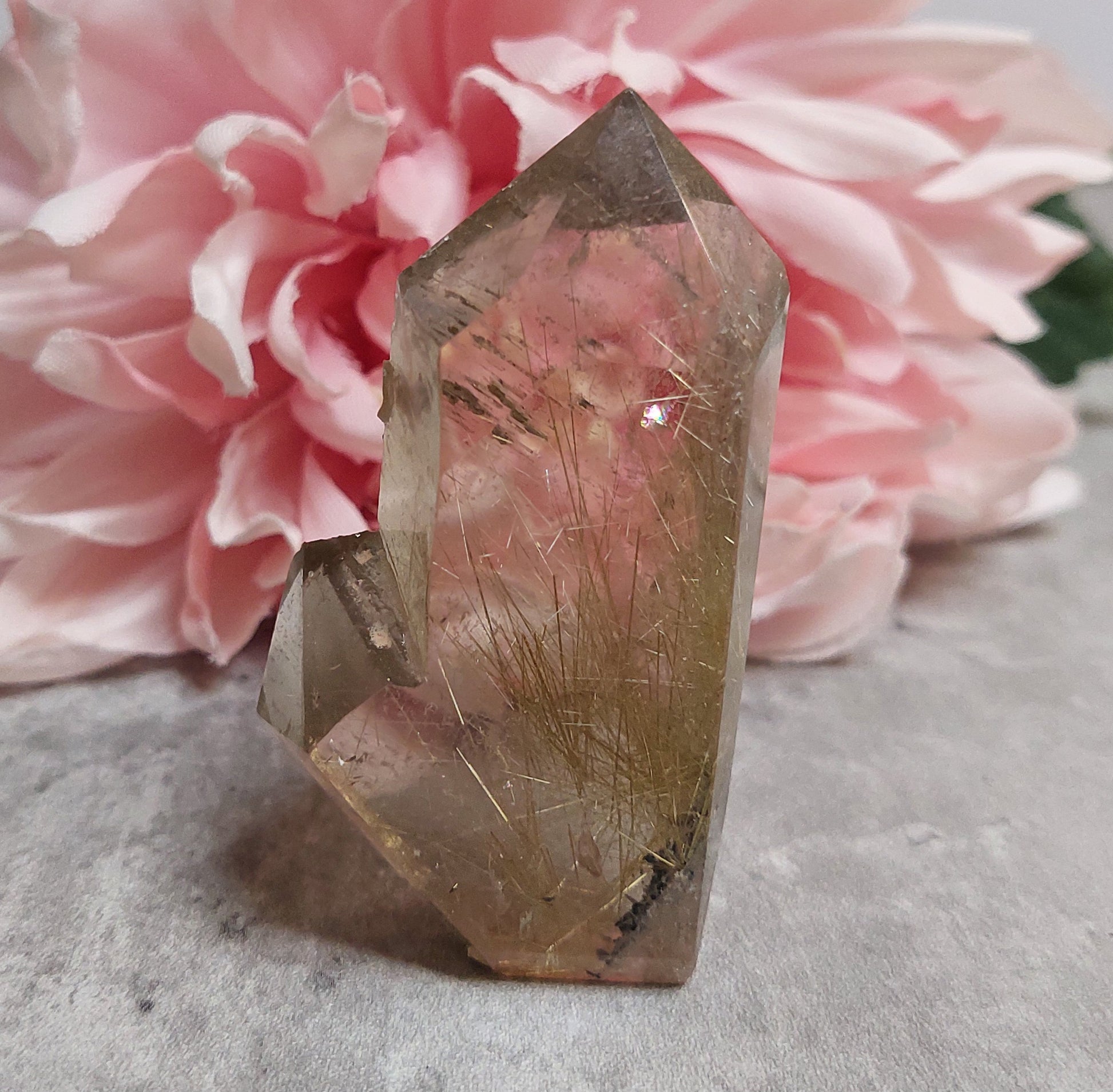 Kirkkaassa savukvartsipohjassa kultaista rutiilia. Malli kaksikärkinen torni.