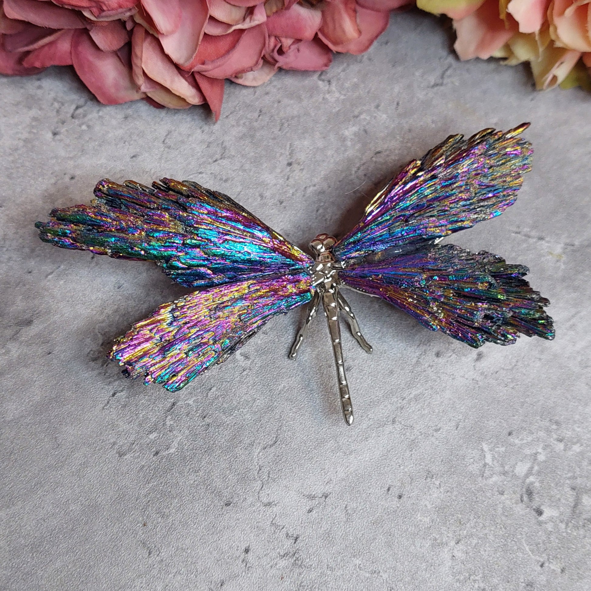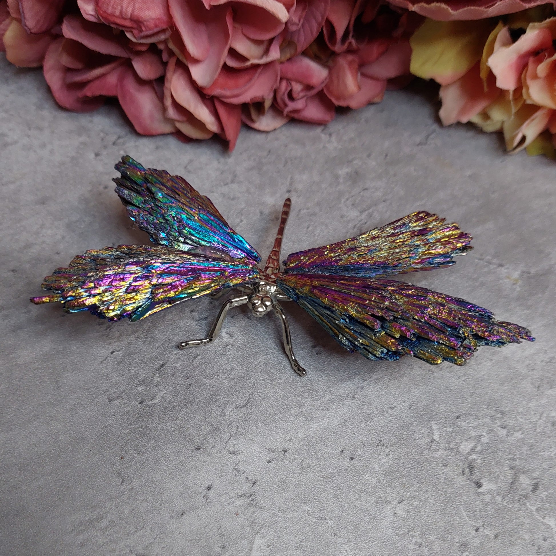 Hopean värinen metallisudenkorento, jolla aurapäälystettystä mustasta kyaniitista monikerroksiset siivet. Siivet on liimattu kiinni, niin ettei niitä saa irti erikseen.