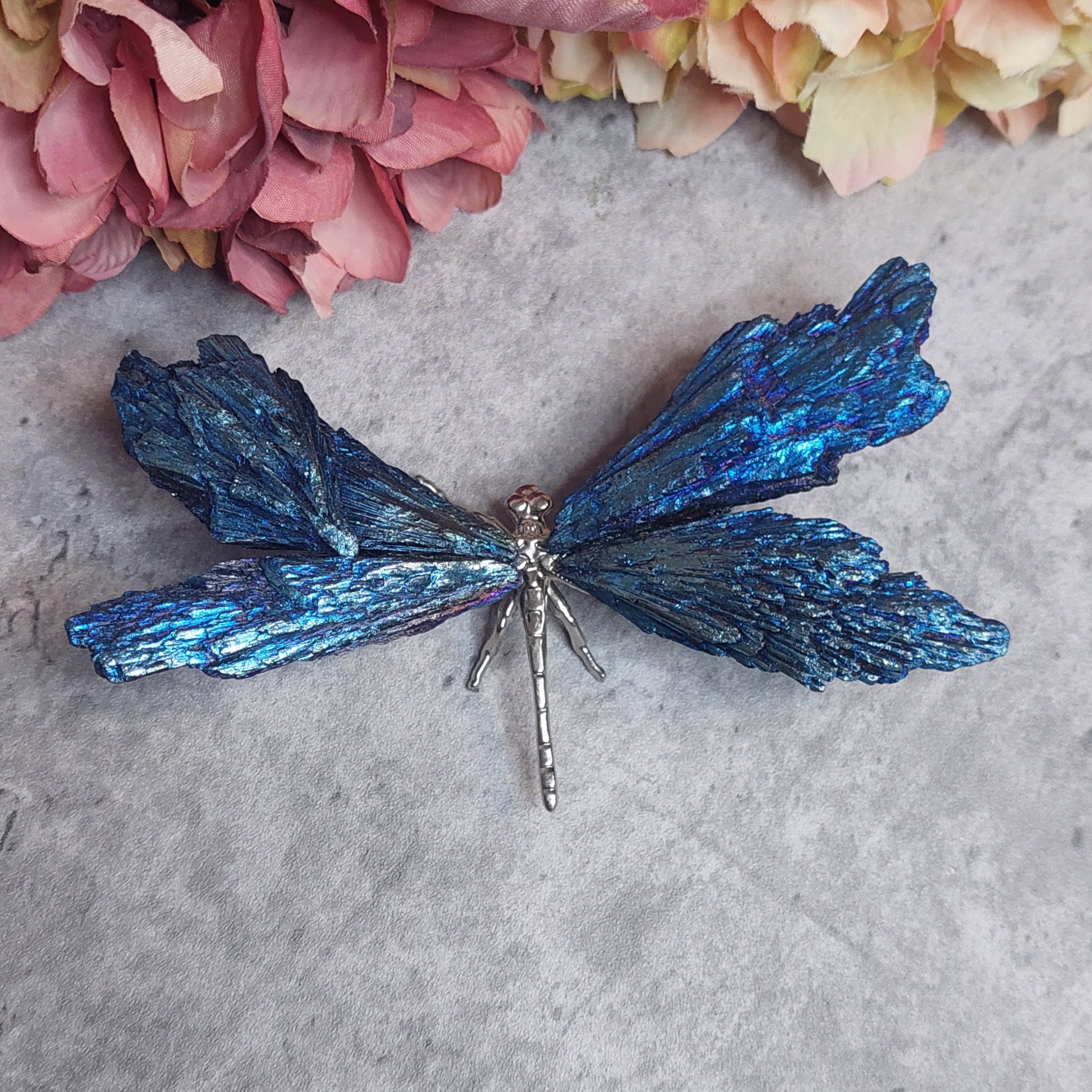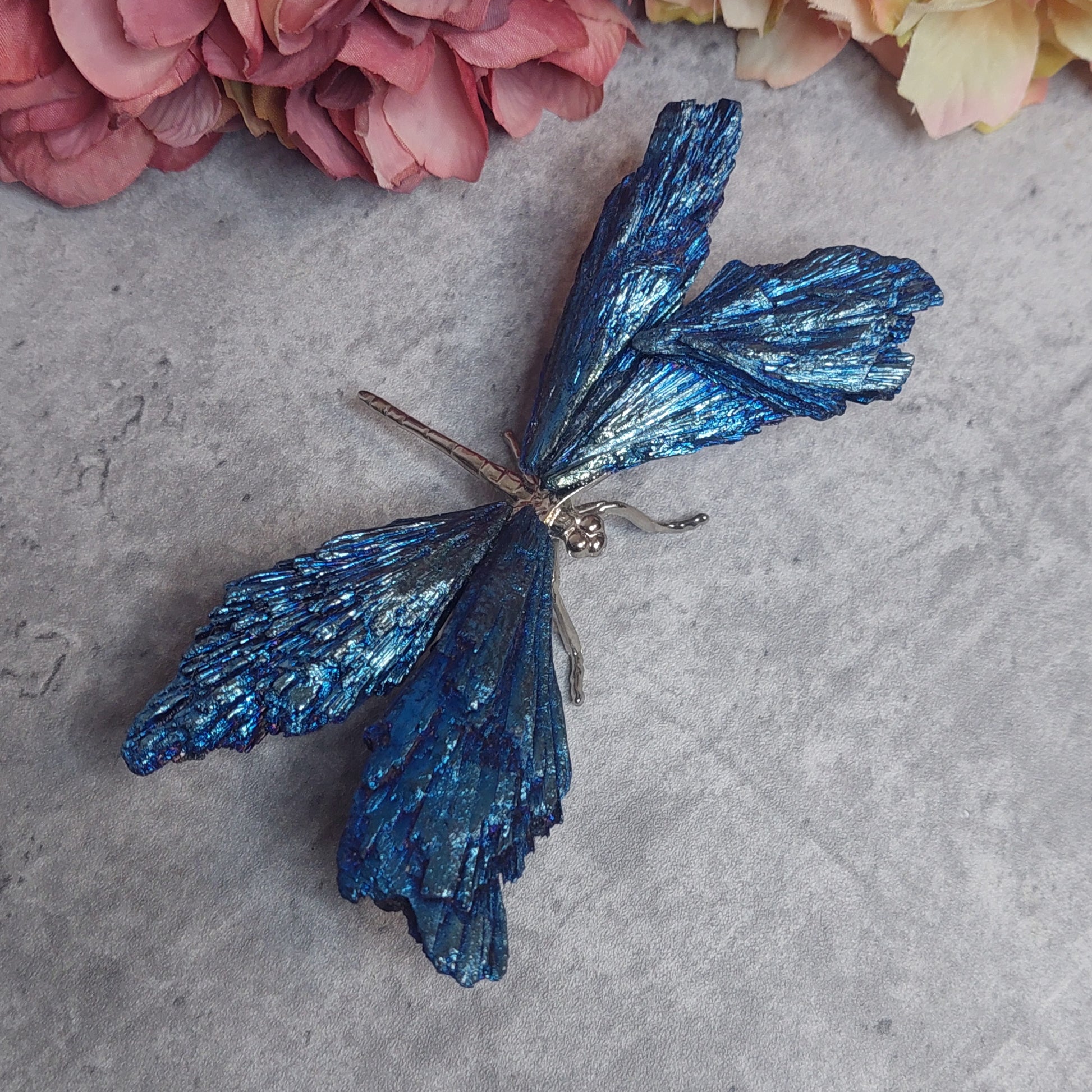 Hopean värinen metallisudenkorento, jolla aurapäälystettystä mustasta kyaniitista monikerroksiset siivet. Siivet on liimattu kiinni, niin ettei niitä saa irti erikseen.