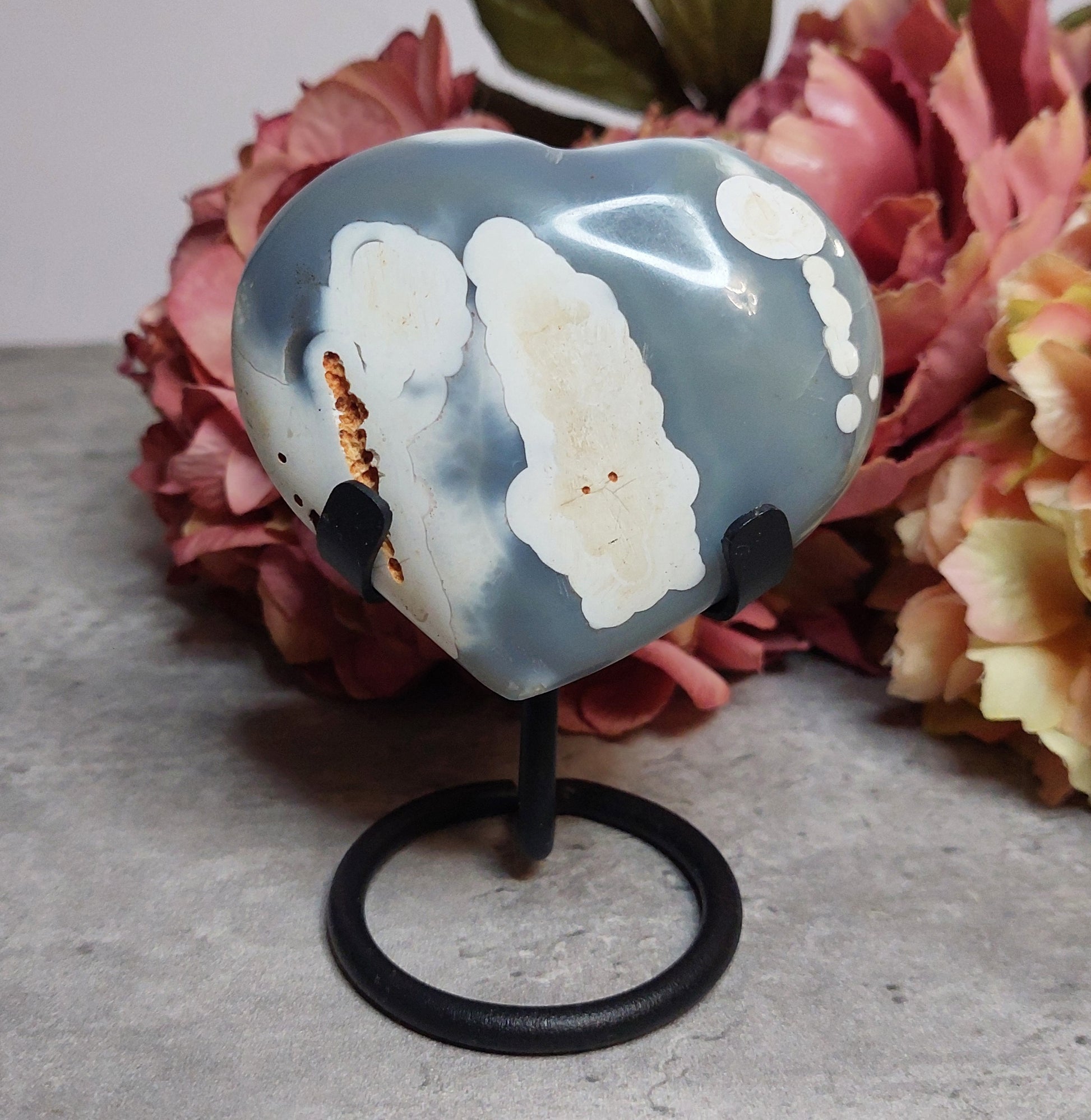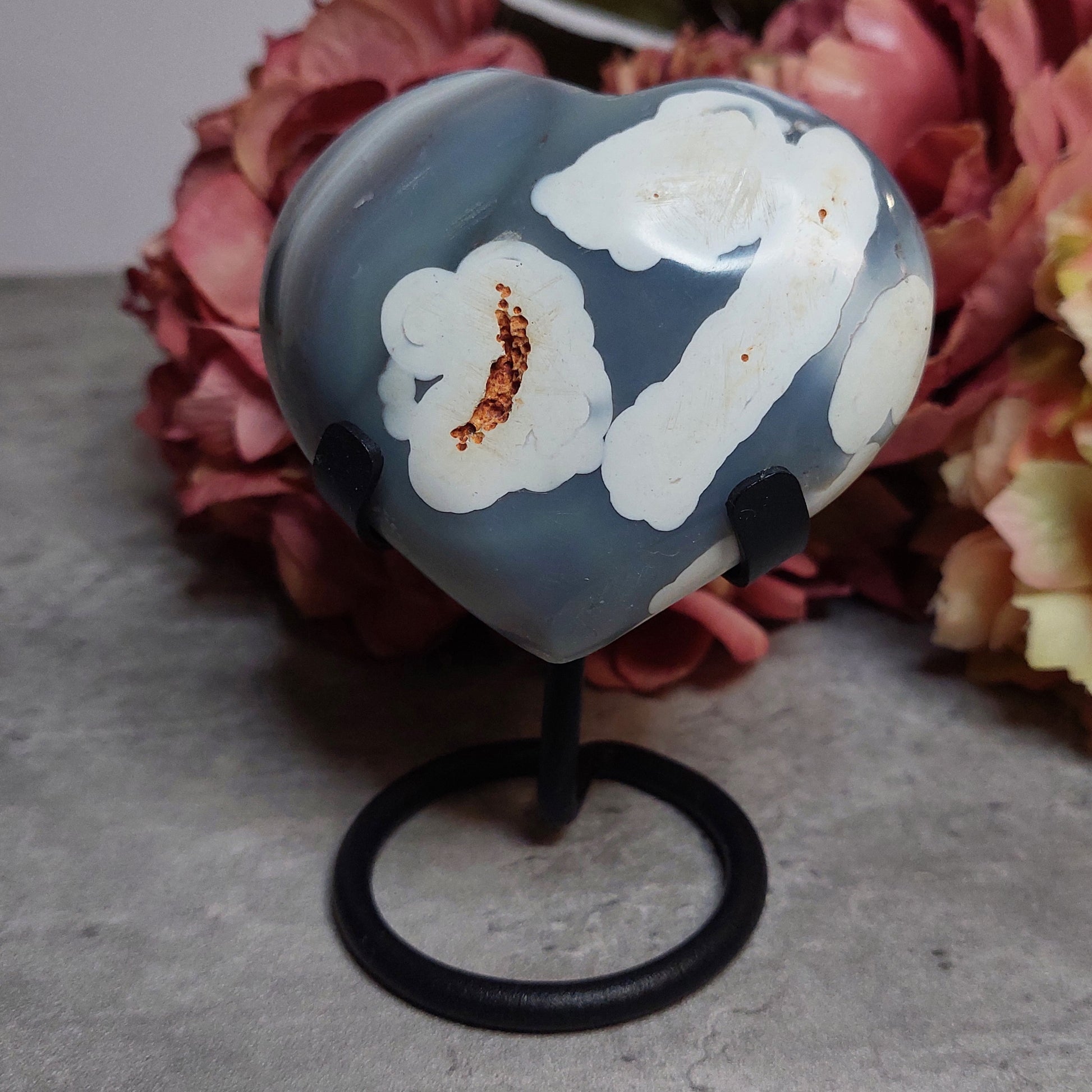 Matalalaatuinen, mutta asiallinen orca-akaatti sydän mustassa mattapintaisessa jalassa.